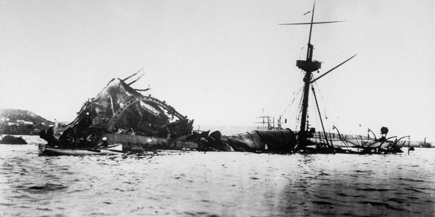 The first example that comes to mind is the battleship USS Maine, which sailed into Havana Harbour in early 1898. The ship had no right to be there, since Cuba was a colony of Spain at the time. The justification given by the American government was that the ship had been sent to protect American interests on the island during a destabilising revolt by Cuban independence groups. On 15 February, a massive explosion destroyed the forward part of the ship, killing 268 sailors, or three-quarters of the crew.